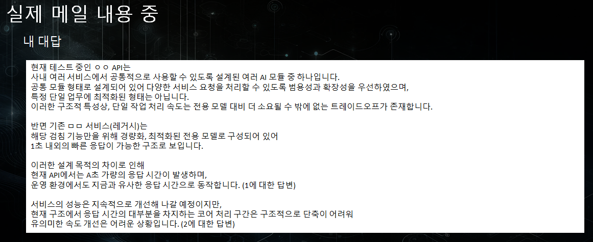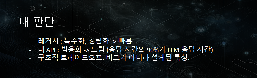 애초에 제가 타겟으로 잡은 서비스는 속도가 그렇게 중요하지 않았으므로, 타겟으로 잡은 플랫폼 서비스에서도 채택되어 사용중인 상황이었죠. 또한 ML이 아니라 LLM 기반이므로, 애초에 응답 시간의 90%가 LLM의 응답시간이라 시간을 크게 줄일 수 없는 상황이었습니다.