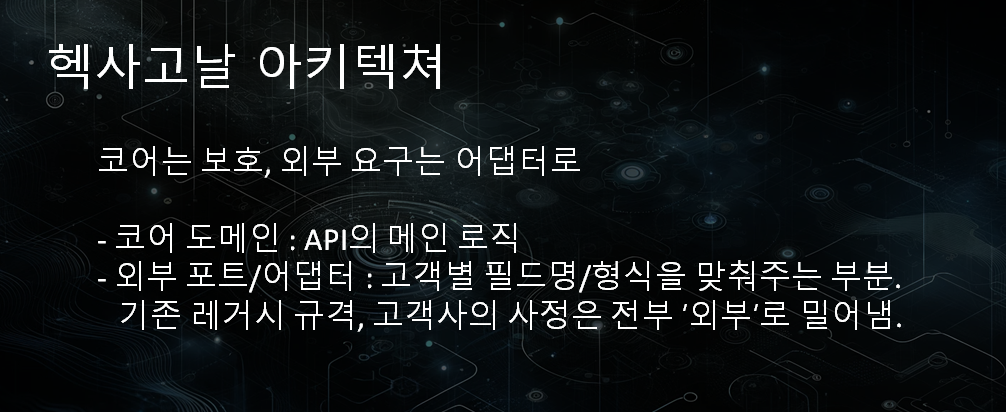 고객 특화 처리는 어댑터에서 처리하고, 도메인 핵심은 외부 규격에 절대 끌려가지 않는거죠..