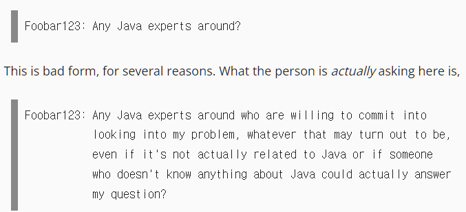 • "~~ 질문좀 해도 될까요?" 이런거 물어보지 말고 그냥 질문하라는 얘기이다.