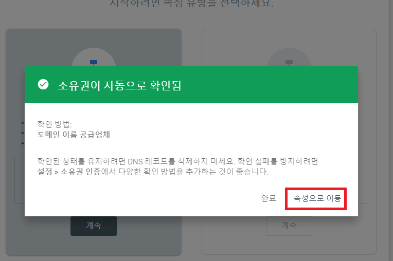 2. 생성했던 개인 도메인을 입력하고 '계속'을 누르면 팝업이 뜨면서 뭔 문자열을 주고 DNS에 등록하라고 함. GSC 화면은 그대로 냅두고 DNS 등록한 사이트로 이동함. 이하 전 가비아 도메인과 DNS를 쓰니 가비아 기준으로 설명함.