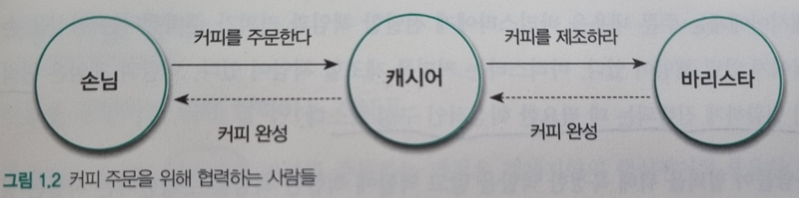 실세계의 커피 주문 과정은 객체지향의 중요한 개념을 거의 대부분 포함하고 있다. '사람'은 '객체'로, '요청'을 '메시지'로, 요청을 처리하는 방법을 '메서드'로 바꾸면 객체지향이라는 문맥으로 옮겨올 수 있다. 이러한 이유로 많은 사람들이 객체지향을 설명하기 위해 실세계의 모방이라는 은유를 차용하는 이유다.