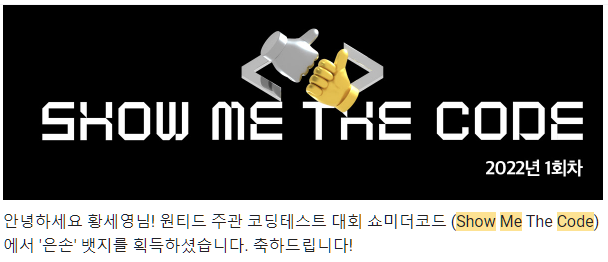 원티드쪽 대회를 백준에서 플랫폼 형식으로 개최한거였다. 등수에 따라 은손, 금손 뱃지를 주고 원티드에서 이력서 지원 시 해당 뱃지가 노출된다는 상품(?)이 있는 대회였다. 난이도는 실버~골드정도였는데, 쉬운거였는데 그땐 생각이 안나서 한 문제를 못풀었다. 담번에 금손 뱃지 달아야지!