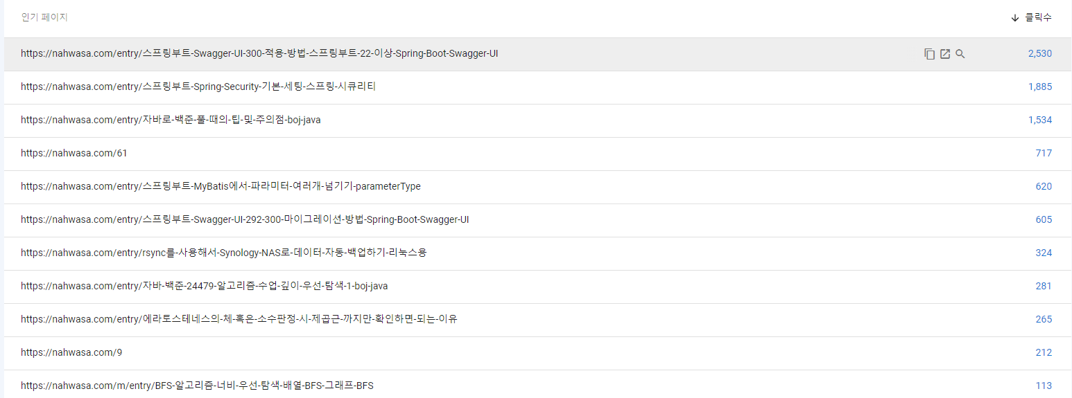 전반적으로 스프링부트 관련된게 인기가 많은 것 같다. 그 외에도 특히 열심히 써던 BFS 글이 그래도 클릭수가 나름 있는 것 같아서 기쁨. 문제 해설 적어둔건 깊이우선탐색1이 특히 많이 들어오는 것 같다. 이유는 모르겠다..