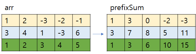 마찬가지로 prefixSum 배열을 추가로 만들지 않고, 기존 arr 배열의 값이 이후 필요가 없다면 arr에 바로 만들어도 된다. 코드로는 다음과 같다.
