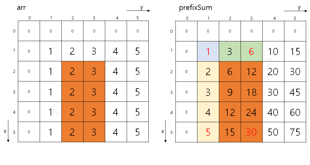 prefixSum[i][j] = prefixSum[i-1][j] + prefixSum[i][j-1] - prefixSum[i-1][j-1] + arr[i][j];