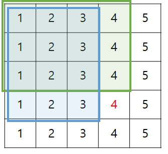 그럼 prefixSum[x][y]를 만들었다면, 그림(그림은 입력으로 들어온 값을 나타낸다. 즉 arr[][]이다. 또한 마찬가지로 인덱스는 1번부터 사용하도록 했다.)의 빨간 부분 (3, 3)부터 (5, 5)의 합을 어떻게 구할 수 있을까? prefixSum[5][5]는 (1,1)부터 (5,5)까지의 합을 나타내므로 해당 부분에서 저 녹색 부분(prefixSum[2,5])을 빼주고, 노란 부분(prefixSum[5][2])을 빼주고, 두번 빠진 녹색과 노란색이 만나는 부분(prefixSum[2][2])를 한번 더 더해주면 될 것이다.