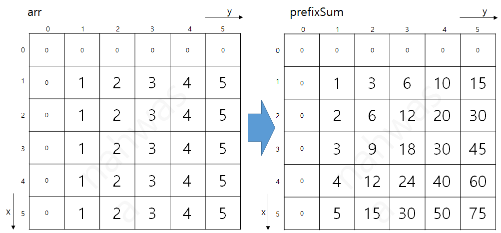 prefixSum[i][j] = prefixSum[i-1][j] + prefixSum[i][j-1] - prefixSum[i-1][j-1] + arr[i][j];