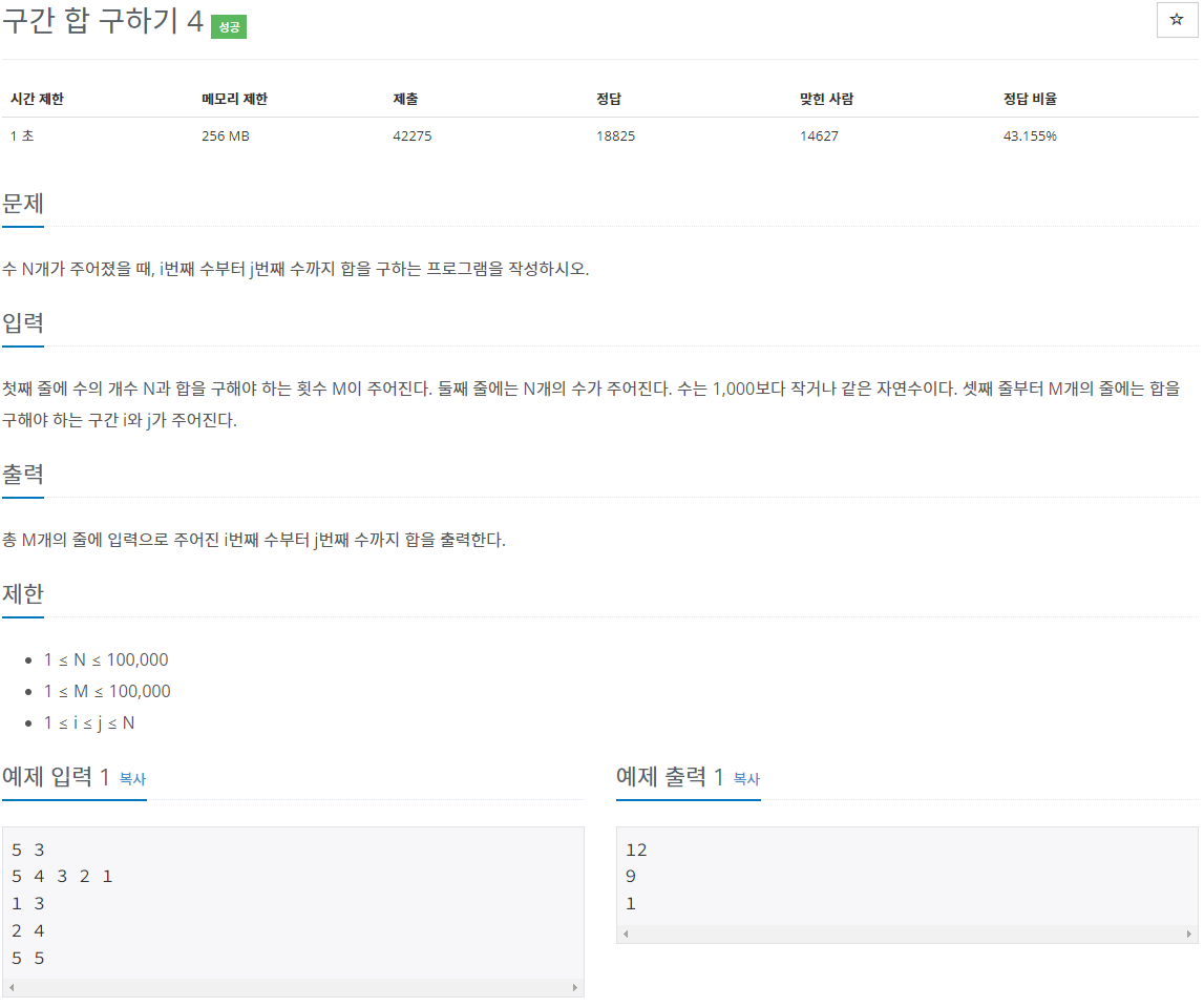 특정 구간의 합을 구하는 경우를 생각해보자. 예를들어 백준의 구간 합 구하기 4 문제를 보자.