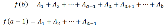 a<=b 이므로 f(b)의 중간에 Aa가 들어가게 된다. 그렇다면 f(b) - f(a-1)은 다음과 같고, 그건 우리가 알고싶은 a번째부터 b번째까지의 구간 합이 된다.