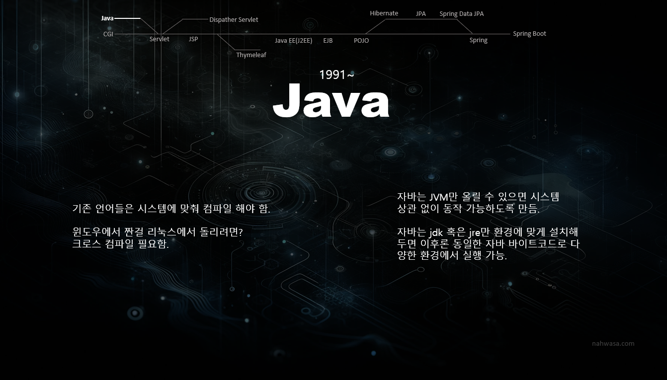 1991년 제임스 고슬링이 만들었습니다. 당시 썬 마이크로시스템즈 다녔고, 2010년에 오라클에 썬마이크로시스템즈가 인수 합병되었습니다. 그래서 요즘 오라클 사이트 들어가서 jdk 받거나 하게 된 겁니다.