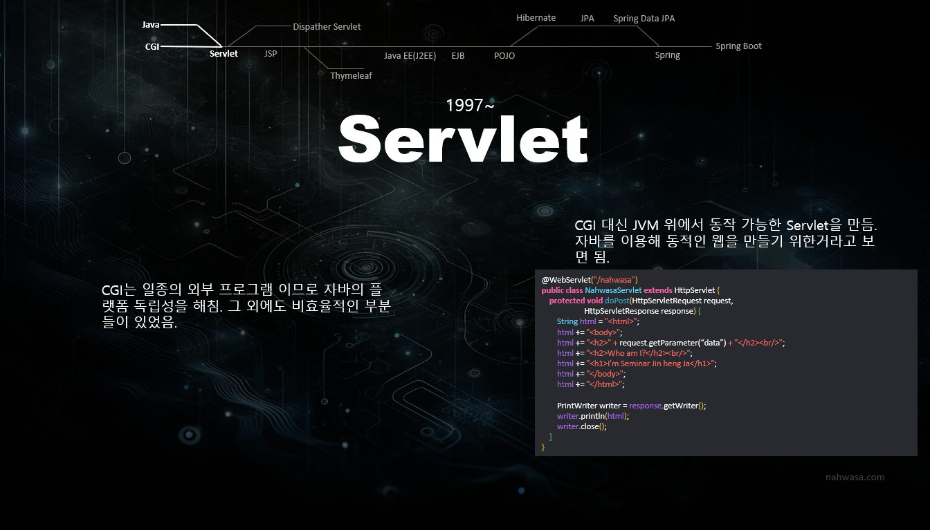 HttpServlet을 상속받아 구현해두고, web.xml에 등록해두면 요청이 들어올 시 doPost()나 doGet()에 구현된 내용을 실행해 그 결과를 리턴해주는 방식으로 동적으로 작동하는 웹 컴포넌트를 만든 것 입니다. CGI와 달리 요청 시 스레드를 생성합니다. 그리고 JVM위에서 동작 합니다.