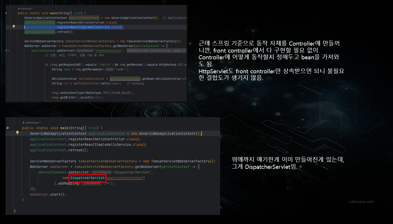 서블릿으로 웹 서비스 구현 시 톰캣처럼 서블릿을 지원하는 서블릿 컨테이너를 사용합니다. 서블릿 컨테이너는 서블릿 생명주기를 관리해주고, 통신이나 보안, 멀티스레드 관리 등을 해주는 녀석입니다. front controlle를 둠으로써 HttpServlet에 대한 의존성을 없앨 수 있고, 저게 생김으로 인해 이제 매번 등록하는 과정 없이 그냥 @Controller 같은걸로 개발이 가능해진 것입니다.