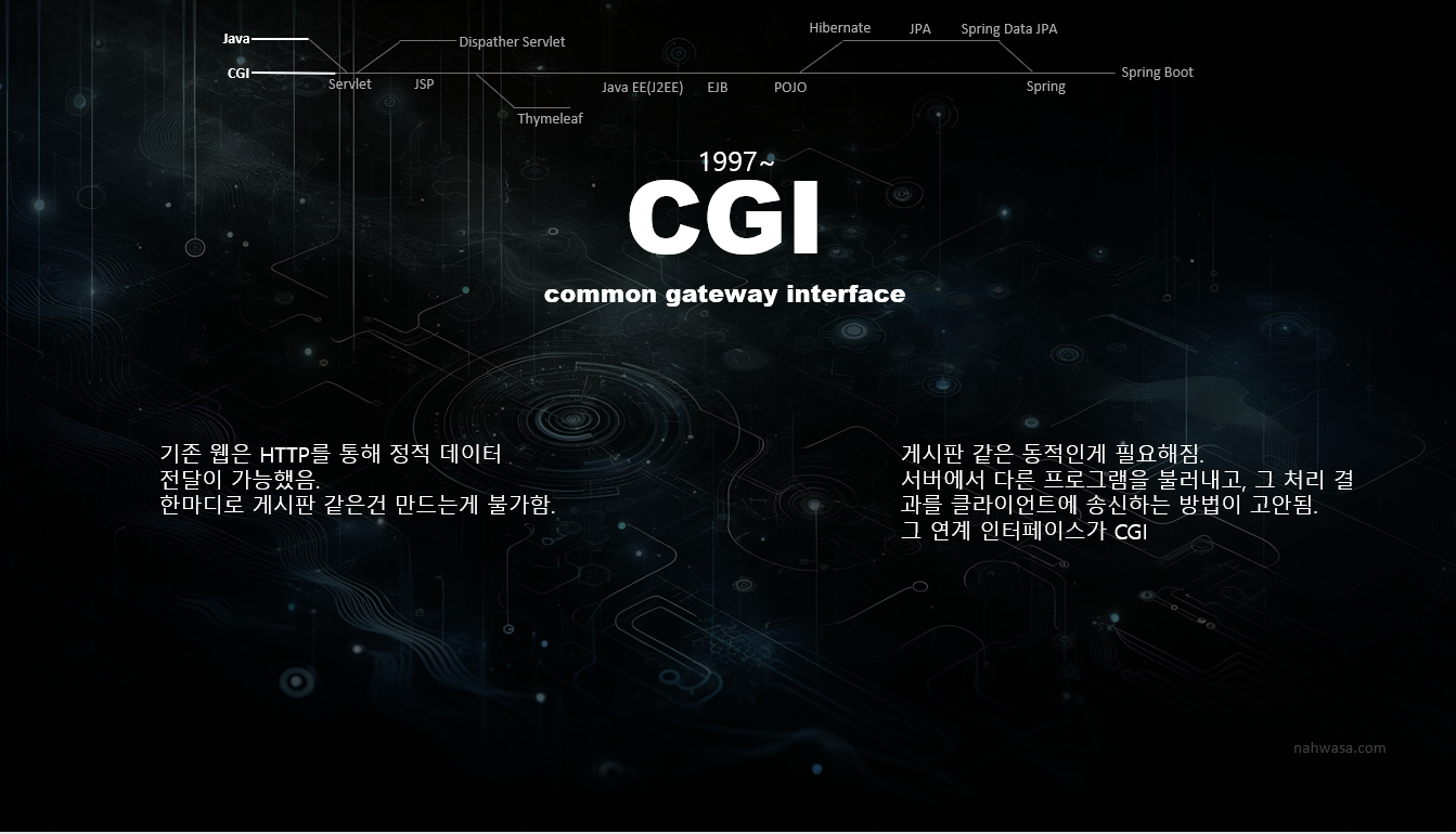 PHP, ASP, 펄 스크립트, C, 파이썬 등으로 CGI를 구현할 수 있습니다. 자바로도 구현 가능합니다. 일종의 스펙이므로 언어 무관하게 구현 가능합니다. 다만 단점은 요청 마다 새로운 프로세스를 생성하고, DB connection을 새로 여는 방식 입니다.