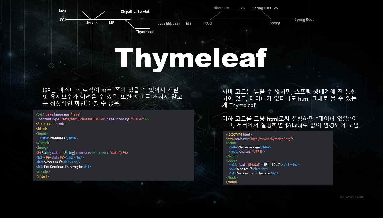 그래서 비즈니스 로직이 세는걸 막기 위해 JSP를 쓰더라도, JSP에 자바코드를 넣는건 지양해야 합니다. 그리고 JSP는 war로 빌드해야 하지만, 타임리프는 jar로 컴파일해도 됩니다.