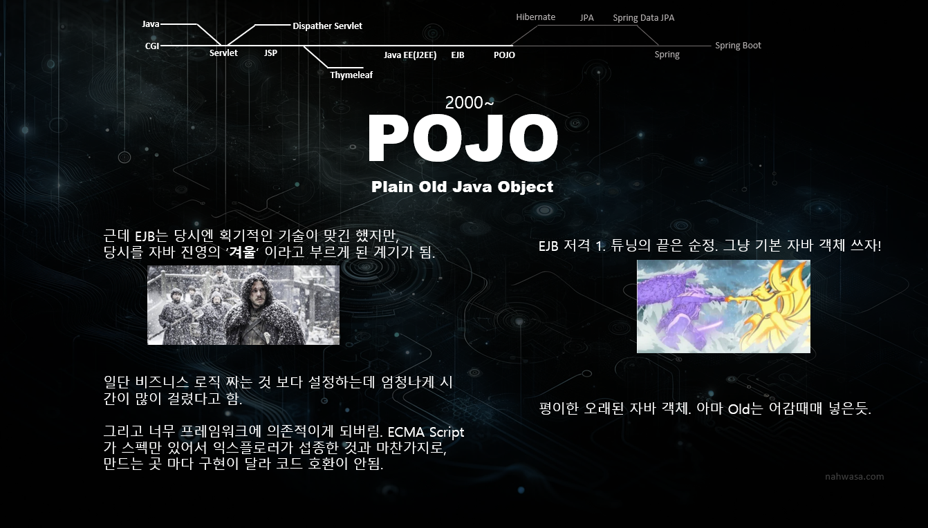 POJO는 좋은 거긴한데, 어쨌든 J2EE같은 프레임워크가 필요하긴 했습니다. 그러다보니 POJO 기반의 프레임워크들이 나오기 시작합니다.