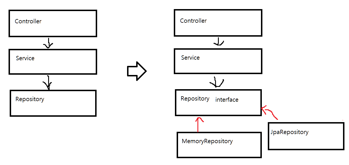 - ☆ '역전'이라는게 들어간건 로버트 마틴이 의존성 방향이 전통적인 절차형 프로그래밍과 반대 방향이라서 그렇게 단어를 넣은걸로 알고있다. 예를들어 스프링부트 프로젝트에서 대충 3계층짜리 layered architecture를 쓴다고 해보자. 이 때 repository를 interface로 뺄 경우 DIP가 적용되고, 이하처럼 의존성 방향이 역전된다. 또한 상위 모듈(Service)는 Repository interface라는 '추상화에 의존'하며, 세부 사항(MemoryRepository, JpaRepository)이 추상화(Repository interface)에 의존하여 위 DIP 설명에 맞게 작동된다.