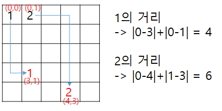이 때 나올 수 있는 특정 경우에 대해 거리는 다음과 같이 구하면 된다. (Manhattan distance, Taxicab geometry)