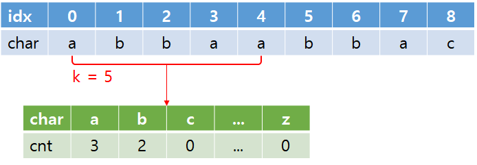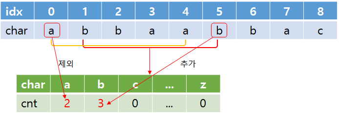 그리고 다음 character를 볼 때는 그 이전 k개를 모두 세는게 아니고 다음과 같이 범위가 이동했다고 보면 이전 범위의 가장 왼쪽을 cnt에서 -1하고, 현재 character를 cnt에서 +1 해주면 된다. 최종적으로 O(26 * 100000)으로 구할 수 있다.