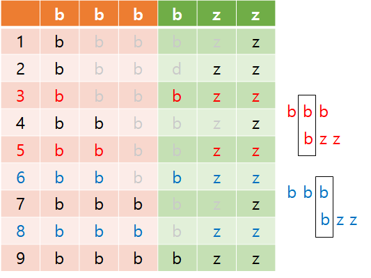 bbb와 bzz를 확인해보자. 이와 같이 동일한 문자가 존재하는 경우 중복값이 발생한다. 다만 이 때, A 단어의 맨 앞 문자는 무조건 들어가야 하고(non-empty prefix), B 문자의 맨 뒤 글자도 무조건 들어가야 하므로(non-empty suffix) A 문자의 맨 첫문자와, B 문자의 맨 뒤 문자는 제외하고 생각한다.