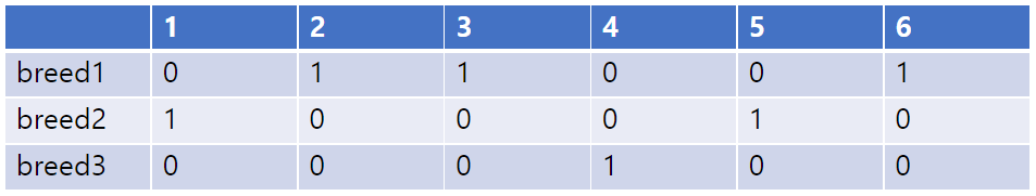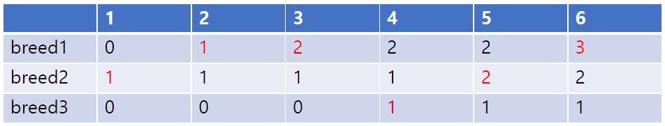 예제 입력1에 대해 그려보면 다음과 같다. N번 소에 대해 breed1,2,3를 사용했음을 기입한 것이다.