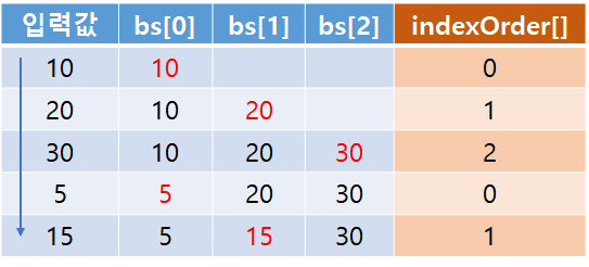 추가로 배열을 더 사용해서 이번엔 각 입력값이 LIS 알고리즘에서 몇 번 인덱스에 들어가게 되는지 확인해보자. indexOrder라는 배열에 넣어봤다. 예를들어 3번째 입력값인 30에서 indexOrder가 '2'인 것은 bs 배열 인덱스 2번 위치에 해당 숫자가 들어갔다는 의미이다.