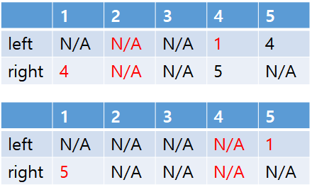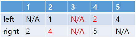 n개의 배열을 2개 더 추가해서 하나는 자신의 왼쪽 팬 번호, 나머지 하나는 자신의 오른쪽 팬 번호를 기입해보자. left와 right라고 하겠다. n=5인 경우에 대해 그럼 맨 처음엔 아래와 같이 표현할 수 있을 것이다.