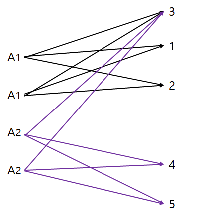 A1은 '2 3 1 2 3'에 해당하고, A2는 '2 3 3 4 5'에 해당한다. 그래프에 A1과 A2가 두 개씩 있는 것은, 둘 다 2개의 수업을 들어야 하기 때문이다. 이제 위에서 말한 '이분 매칭' 방식을 진행하면서 만약 좌측의 A1, A1, A2, A2 중 하나라도 매칭에 실패한다면 졸업이 불가하므로 '-1'을 출력하고 끝내면 된다.