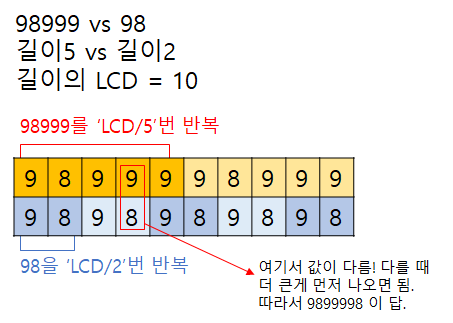 케이스2 - 그럼 98와 98999이 있다면 어떨까? 직관적으로 98999를 먼저 두는 것이 이득임을 알 수 있다. 이 경우는 '케이스1'로는 판단할 수 없는 경우이다. 그렇다면 자리수가 다르면서, 둘 중 작은 자리수까지 비교해도 비교가 안되는 경우를 어떻게 판단할지가 관건임을 알 수 있다.