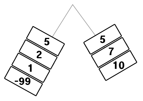 이런식으로 [-99, 1, 2, 5] + [5, 7, 10] 으로 나눌 수 있음.