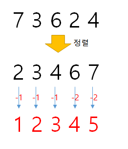 따라서 우선 입력으로 들어온 값을 오름차순으로 정렬해보자. 그리고 1부터 1개씩 증가시키며 해당 값에 한명 이상 매칭시켜보자. 예를들어 '예제 입력1'은 다음과 같이 처리할 수 있다. '7 3 6 2 4'로 들어온 입력을 우선 정렬한다. 그 후 1번의 Defile로 모두 박탈시키려면 1부터 차례대로 매칭시키면 된다(정렬을 하지 않으면 최소수치가 아니게 된다.). 이하 그림에서 '-'값들을 모두 합쳐보면 답인 7이 나오게 됨을 알 수 있다.