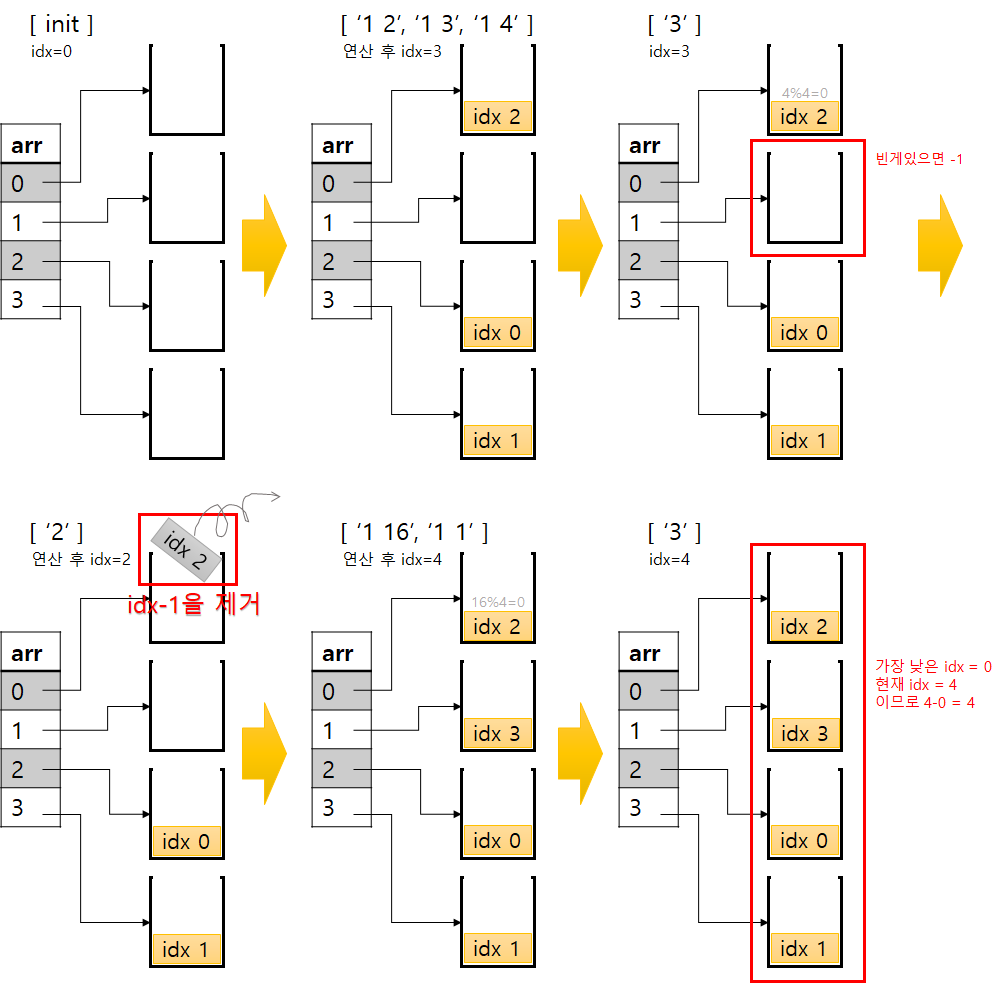 내 경우엔 어차피 맨 뒤에서만 수가 추가되고 빠지니 스택을 사용했다. 그리고 mod개 만큼의 스택을 마련했다. 스택배열을 arr이라고 하고, 현재 넣을 위치를 idx라고 하겠다. 그럼 각 쿼리에 대해 다음과 같이 대응할 수 있다.