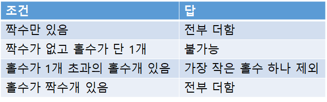 이제 전체 로직을 살펴보자. 짝수를 만들 수 있는 경우를 살펴보면 된다. 우선 짝수+짝수는 당연히 짝수이다. 홀수+홀수도 역시 짝수이다. 따라서 짝수는 그냥 넘어가면 되고, 홀수는 홀수인 것이 짝수개 있다면 짝수로 만드는데 문제가 없다. 이제 문제는 홀수가 홀수개 있는 경우인데, 이 때는 한 개의 수를 제외해야 한다. 당연히 가장 작은 홀수를 제거하는 것이 이득일 것이다.
