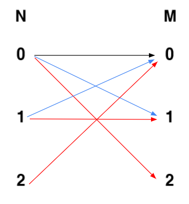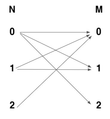 3. 다음으로 N-2가 M-0을 확인하는데 M-0이 이미 매칭되었으므로 matching(1)이 돌아간다. matching(1)에서 M-1을 확인하는데 다시 점유되어 있으므로 matching(0)이 다시 돌고, 최종적으로 N-0이 M-2과 매칭되고, N-1이 M-1과 매칭, N-2가 M-0과 매칭되면서 3개 다 매칭되게 된다.