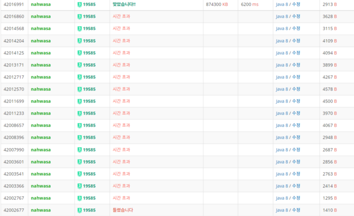 다른 의미로 전설이었다. 보통은 포기하고 넘어갔을텐데 이론상(?) 가능할 것 같아서 계속 하다보니 오기가 생겨서 끝까지 해보기로 했었다 ㅋㅋㅋ 풀고보니 자바한정으로 통과하기 어려운 문제였다. 시간초과난 로직으로 다른 언어론 통과가 되더라 ㅠ