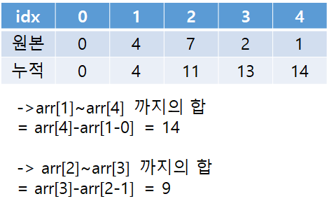 예를들어 '4 7 2 1'을 확인해보자. 다음과 같이 누적합 배열(arr)을 마련해두면, i번째부터 j번째 수까지의 합은 arr[j]-arr[i-1]로 O(1)에 바로 구할 수 있다.
