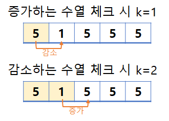 '5 1 5 5 5'와 같은 경우를 보자. 이 경우 증가체크, 감소체크 둘 다 성립된다. 하지만 증가하는 수열로 체크시엔 k가 1이 되고, 감소로 체크시엔 k=2가 되므로 '가능한 k가 여러 개면 가능한 가장 작은 k를 출력' 조건에 따라 1을 출력해줘야 한다.