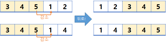 참고로 k는 증가하는 수열로 보고 있는 경우 처음 감소된 위치의 index, 감소하는 수열로 보고 있는 경우 마찬가지로 처음 증가된 위치의 index가 된다. 예를들어 위의 '3 4 5 1 2' 경우 index가 2->3으로 가면서 감소하였으므로 k=3이다.