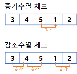 따라서 증가하는 수열로 보자면 감소하는 경우가 1번일 경우 수열의 맨 처음값이 수열의 맨 뒷값보다 크거나 같아야 성립함을 알 수 있다. 마찬가지로 감소하는 수열로 체크한다면 증가하는 경우가 1번일 경우엔 수열의 맨 처음값이 맨 뒷값보다 작거나 같아야 성립한다.