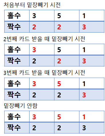 그럼 5번을 받을 차례 때 밑장빼기를 하면 어떻게 될까? '5'를 받을 차례에 짝수번째의 마지막에 있는 '3'을 받고, 이후 순서가 변경되면서 짝수번째를 정훈이가 받게 된다. 따라서 밑장빼기를 한 이후로는 짝수번째 카드를 받게 된다.