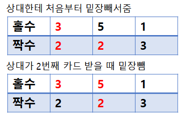2. 정훈이가 상대방한테 밑장을 빼서 주는 경우