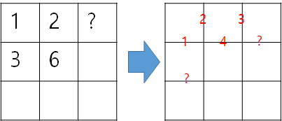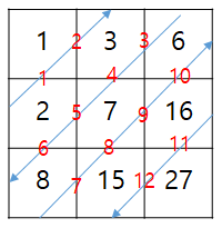 우측 아래로 대각선으로 진행하면서, 수직으로 좌측하단에서 우측상단으로 진행과 우측상단에서 좌측하단으로 진행을 번갈아가면서 순서대로 각 칸 사이의 차이를 쓰면 된다. 그리고 좌측상단에 1을 넣고 시작하면 항상 저 차이만큼 배열에 숫자를 쓰는게 가능하며, N=1000, M=1000 일때도 2x10^9 이내로 가능하다(이 경우 가장 우측하단은 1,996,003,000 이 나온다.). N=3, M=3일 경우 결과는 다음과 같다.