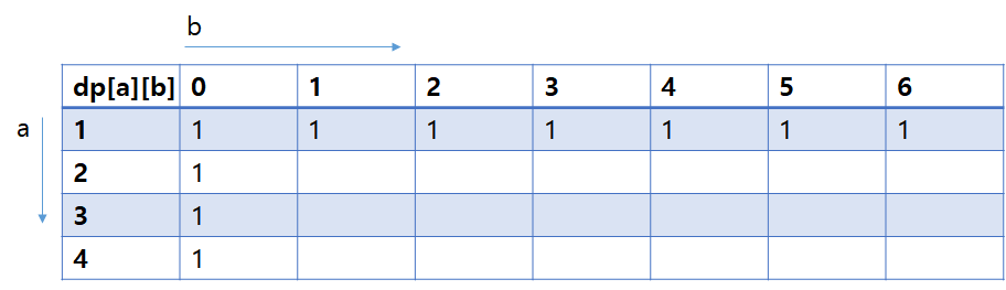 우선 초기값들로 명백한 값을 작성해두자. 1개의 값(a=1인 행)만 사용해 b를 표현할 방법은 하나 뿐이다(순서대로 0부터 n까지의 값 하나만 사용).