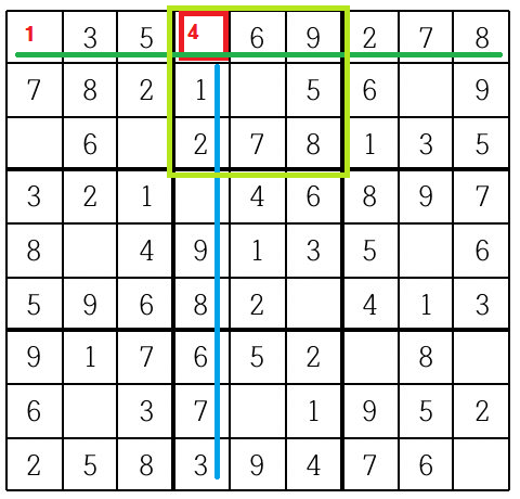 저 빨간부분에는 우선 row를 기준으로 보면(초록색 선) 아직 체크안된 값은 1과 4이다. 그리고 col기준(파란선)으로 보면 역시 1과 4가 들어갈 수 있다. 격자 기준(연두색)으로 보면 1,4,9가 아직 안나왔다. 따라서 셋 다 만족하는건 1과 4 이므로 우선 4를 넣어본다.