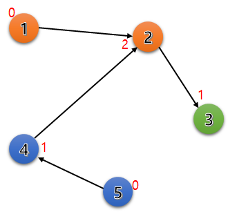 결국 위와 같은 문제가 생기는 경우는, 현재 자신을 향하는 간선이 1개 초과일 때 발생한다. 그러니 이번엔 다음과 각 정점에서 자기 자신으로 들어오는 간선의 개수를 세보자. 이후 자기자신으로 들어오는 간선의 개수를 '차수'라고 하겠다.