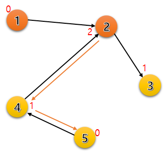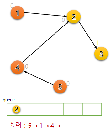 큐에 있던 정점 4를 방문했고, 갈 수 있는 정점 2의 차수를 1 빼준다. 정점 2도 차수가 0이 되었으므로 큐에 추가한다.