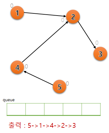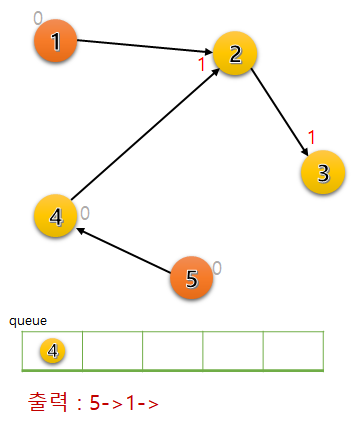 정점 5를 큐에서 꺼내서 방문했고, 5를 출력해준다. 그리고 간선을 통해 진행 가능한 정점 4의 차수를 1 빼준다. 차수가 0이 되었으므로 정점 4도 큐에 넣어준다.