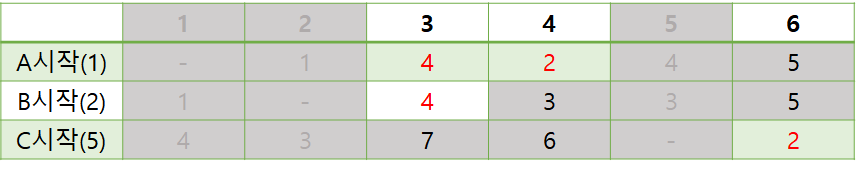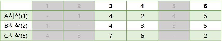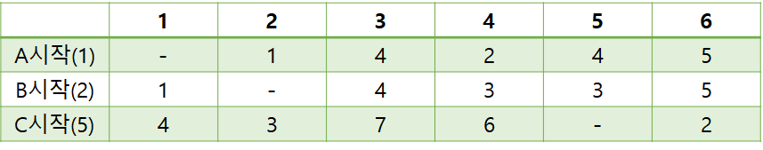 위 그래프를 기반으로 어떠한 X 지점에서 시작해서 모든 정점으로 가는 최단거리를 구해보겠다. 이 때, 시작하는 정점인 X는 각각 A,B,C 이다. 예를들어 C인 5번 정점에서 시작할 경우 3번정점까지의 최단거리는 '7'이다.