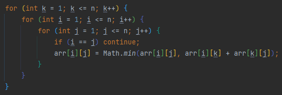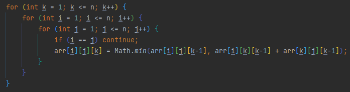 arr[i][j][k] = Math.min(arr[i][j][k-1], arr[i][k][k-1] + arr[k][j][k-1]);