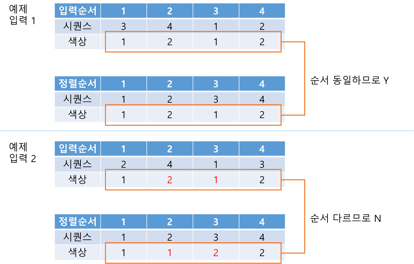 예를들어 예제 입력1과 2는 다음과 같다. 처음 입력으로 들어온 색상과, 시퀀스를 기준으로 정렬된 색상의 순서가 서로 다르다면 N, 동일하다면 Y를 출력해주면 된다.