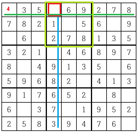 저 빨간부분에는 우선 row를 기준으로 보면(초록색 선) 아직 체크안된 값은 1과 4이다. 그리고 col기준(파란선)으로 보면 역시 1과 4가 들어갈 수 있다. 격자 기준(연두색)으로 보면 1,4,9가 아직 안나왔다. 따라서 셋 다 만족하는건 1과 4 이므로 우선 4를 넣어본다.